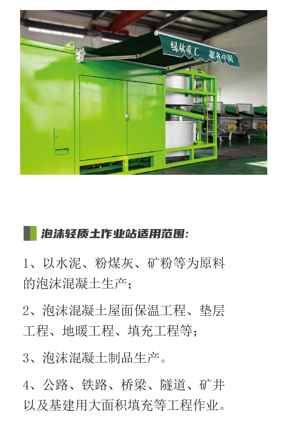 LV-FP-80C泡沫轻质土作业站:既可用于高速路桥头桥背填充,高速路拓宽等,又可用于屋面保温施工等,一机多用。